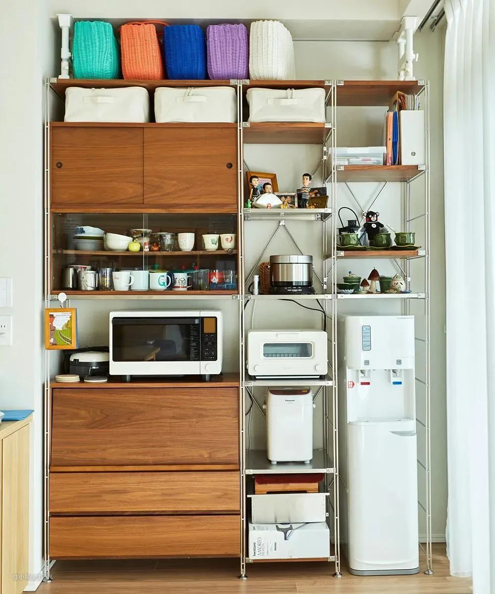 比起全屋的木作手工柜或者定制柜,越来越多的设计也将组合置物架融入全屋规划中,用置物架做柜体收纳。