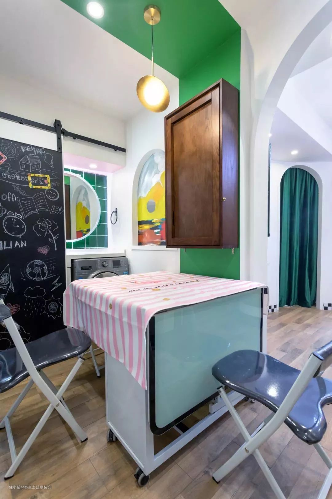 入户玄关走廊和餐厅、卫生间连在了一起,洗衣机嵌入了洗手台下方,侧方墙面隐藏了一个迷你的吧台,多彩的色调让这个空间变得更为有趣。