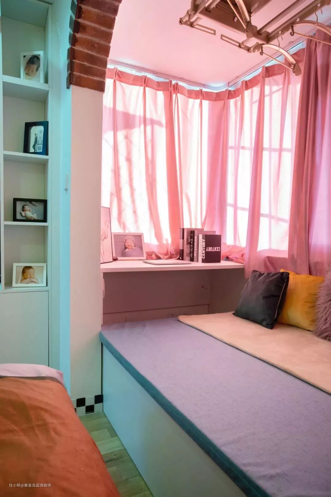 卧室边上的飘窗被改成了休闲区和工作区,在两侧留出放脚的位置和书桌、梳妆台,上方的晾衣杆也保证了一些不太湿的衣服有个晾晒的地方。