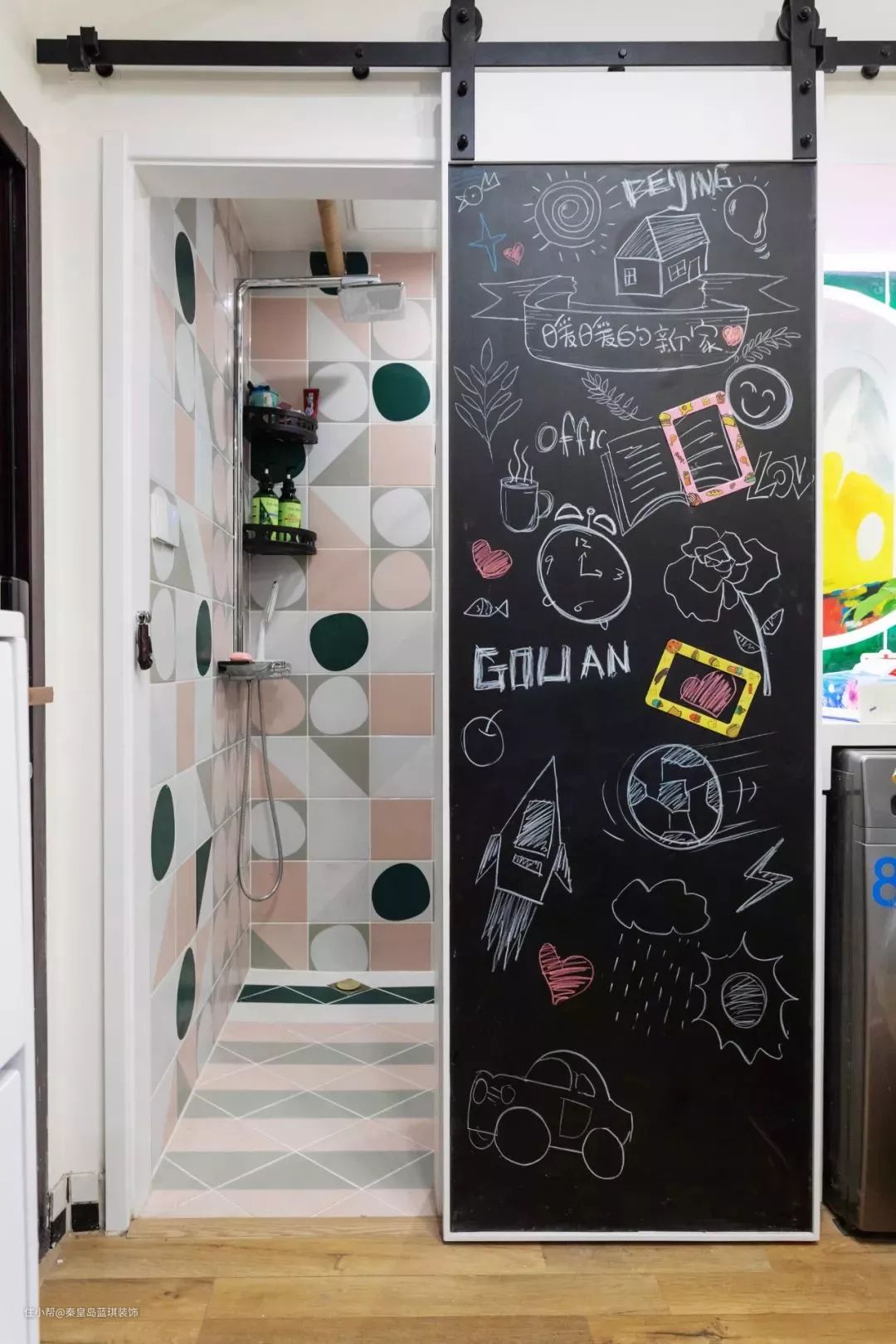 入户门的侧方就是卫生间,用谷仓门作为隔断,还把谷仓门做成了黑板墙的款式,卫生间内部的瓷砖也非常好看,让人感觉浪漫优雅。