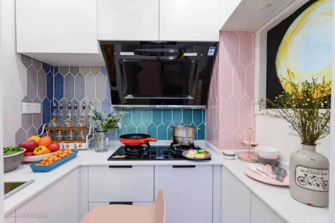 厨房内部的空间比较小,U字形的橱柜布局结合吊柜让储物空间足够充足,只留下一个人转身的空间,也使得厨房动线变得更短。