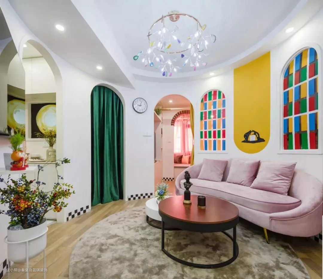 以客厅为中心点来连接餐厅、厨房、主卧和次卧空间,选择用布帘来作为门,让空间显得更为通透,粉色的沙发和多彩的室内窗都是很好的装饰品。