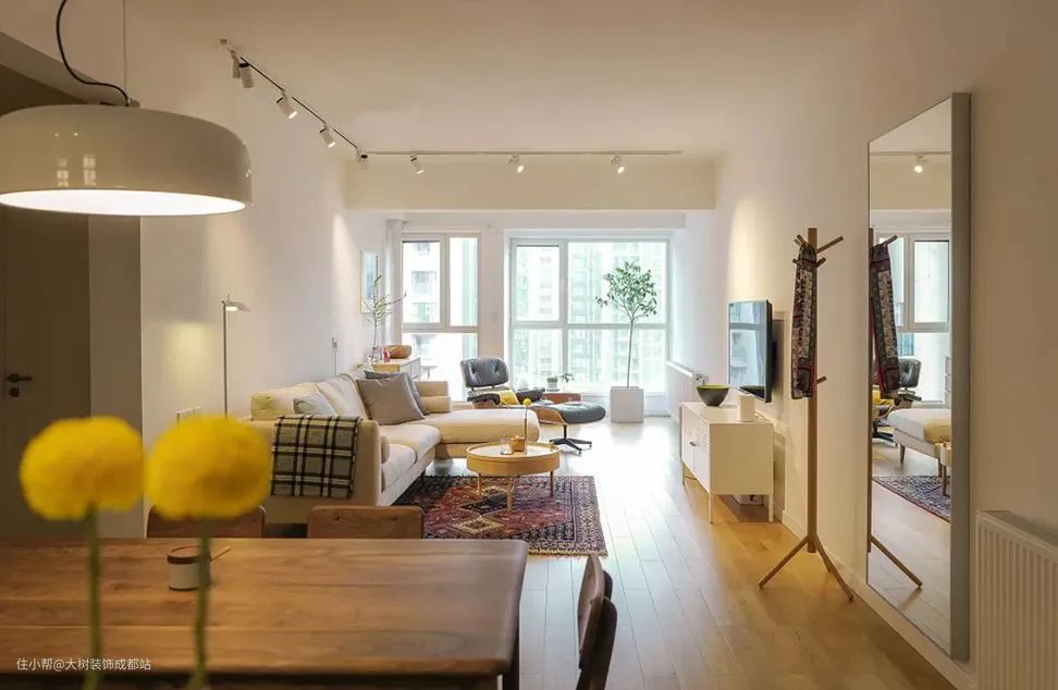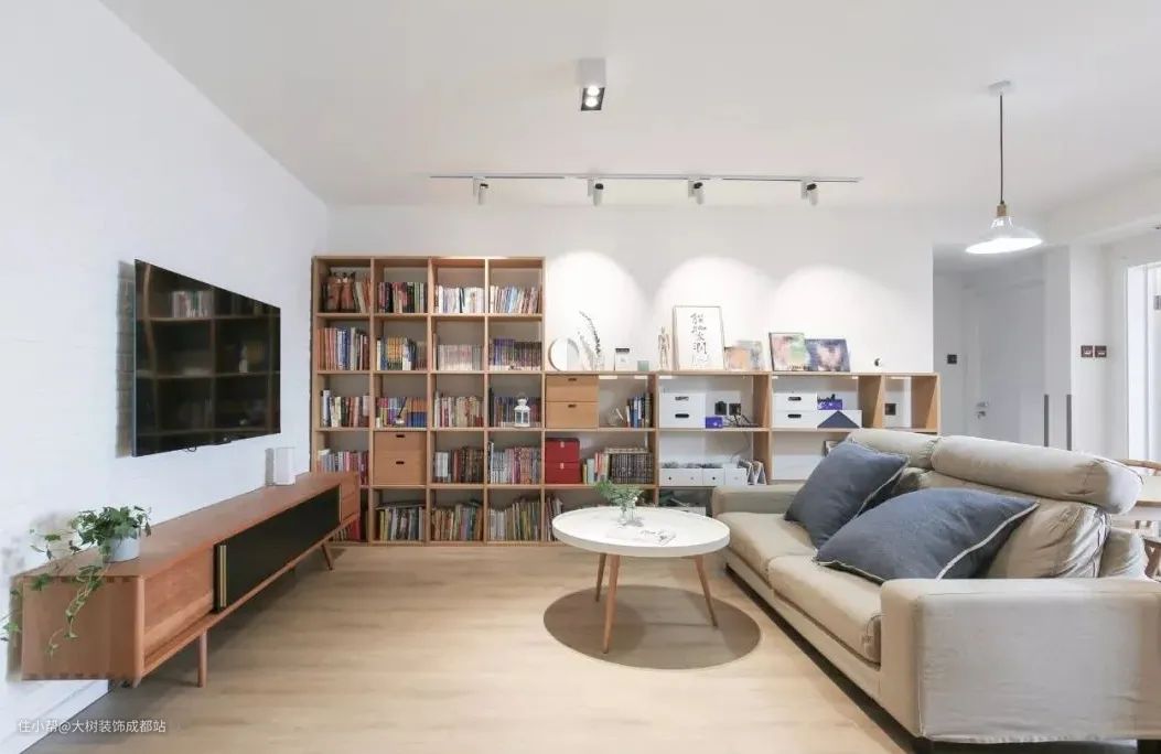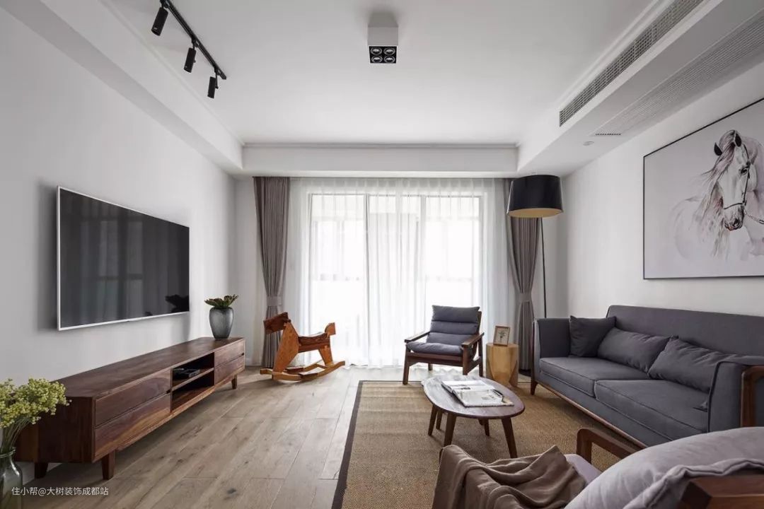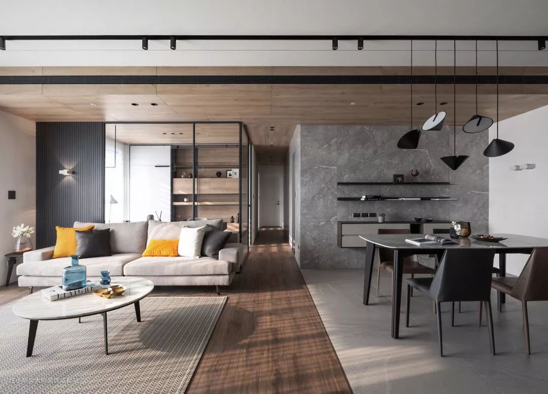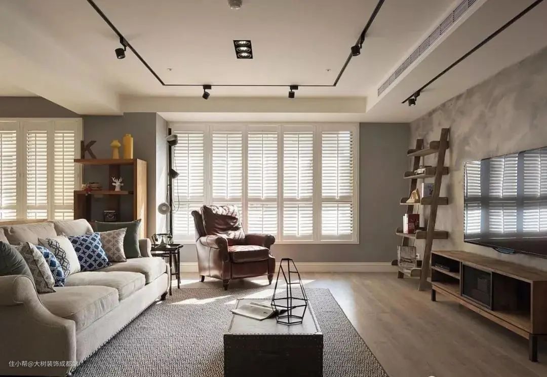 在没有主灯的客厅设计下,电视墙、沙发墙的整个天花板都可以装上轨道灯,不仅让空间的照明氛围变得更加的舒适惬意,同时在视觉上也让空间更具有层次感。
