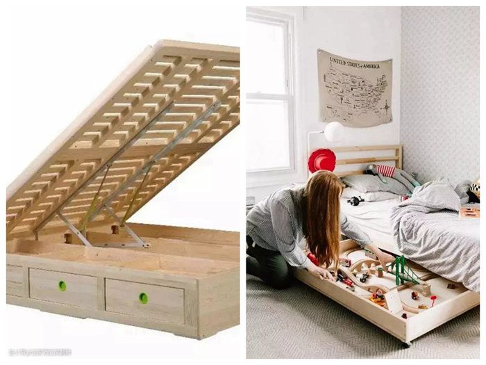 这种床在前期购买的时候就需要考虑到。在床下可以放置几个能活动的抽屉,存放衣物或者孩子的玩具,不用的时候直接推入床下,保证房间整体的干净利落。