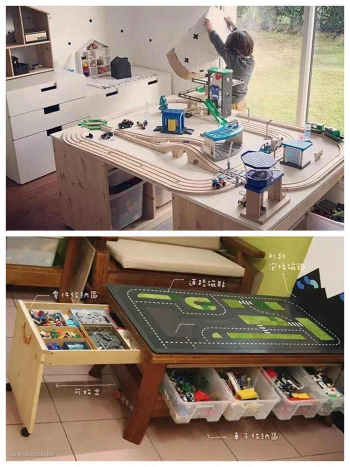 游戏桌的玩法就很多变了,适合乐高、托马斯火车各种娱乐活动。 上面设计成游戏桌还可以利用桌子底下空间设计收纳,桌面玩游戏,随手就能取放道具,有个家长用一块长木板拼接两个桌子,形成岛台式游戏桌,收纳值还能钻洞玩,超级厉害!