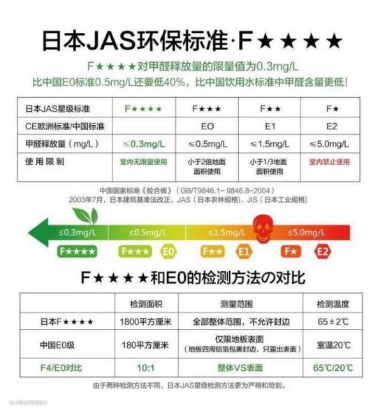 如果家里有抵抗力低的小孩,也可以选国标E1更高的产品,比如日本认证的的F3、F4星(≤0.3mg/L),其中F4星际也是日本环保标准最高的健康等级,更被认为是国际上最健康的环保标准之一,不过市面上可以认证成为F4星级的品牌少之又少,想要拿到认证也很难,能通过认证的品牌真实价格都很高,很多家装品牌大言不惭的自称F4星级“标准”也只是玩了文字游戏而已。