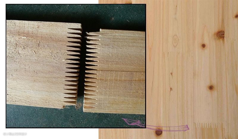 是由原木加工后剩下的余废料拼接而成的板材,每一块小料之间用胶水齿状连接成长条,每一块长条之间再用胶水粘接。