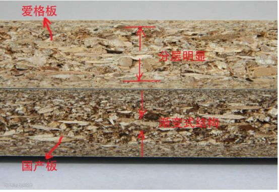 图里能明显看出来,爱格板不论表层还是中间层,都压得更均匀紧密,空隙小,而且木纤维大片又新鲜,不是陈年烂木,下面的看上去杂料比较多,而且有二次利用的可能性。