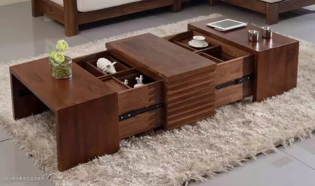 客厅大部分屋主都知道可以利用沙发背景墙和电视背景墙做收纳,其实茶几、沙发也是很好的收纳点,选择可变形的茶几,平时更不会占位置。