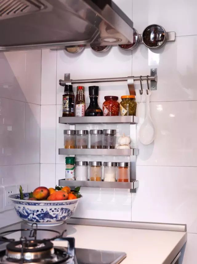 厨房的收纳就是橱柜、吊柜和操作台,但小户型厨房的操作台通常比较小,为了避免切菜都没地方切,可以在墙面做上挂杆、置物架,摆放零碎物品。
