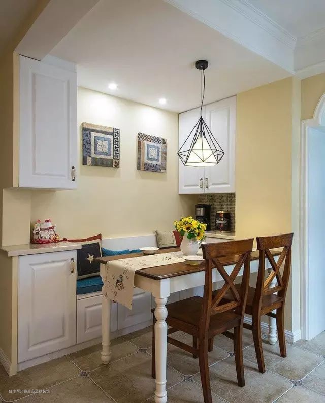 小户型餐厅的收纳大部分都会选择做上一个卡座,卡座的底部可以放一些不常用的东西,而卡座的和上方墙面同样可以利用起来做柜子。