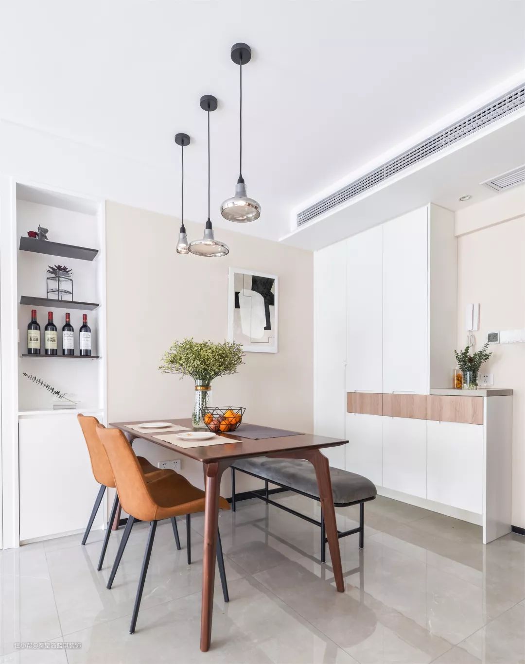 餐厅的墙面刷成了藕粉色,在白色的柜子当中加入了木色作为点缀。餐厅的另一侧还做了部分的嵌入式柜子,作为一个小酒架。
