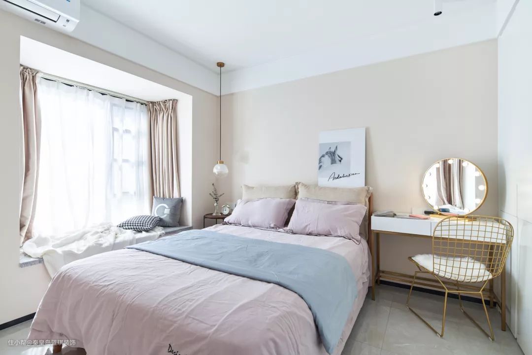 主卧室的墙面同样是选择了藕粉色,搭配粉色的床品和部分的蓝色作为点缀,整个空间看起来优雅浪漫而又清新舒适。