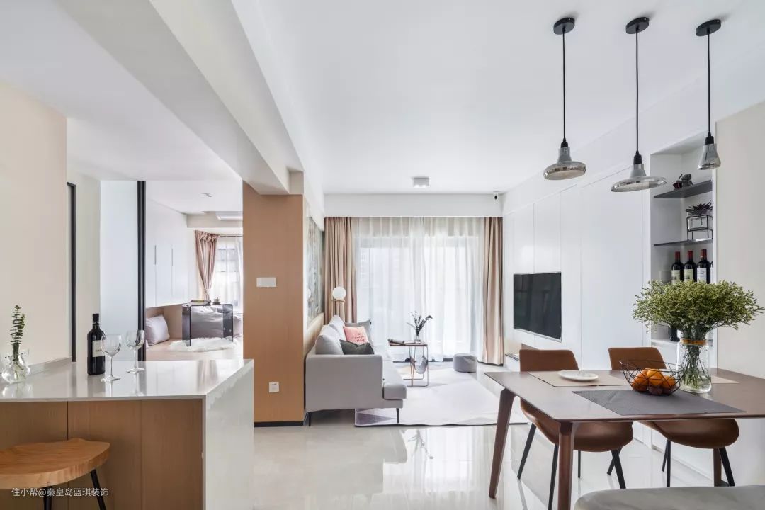 在入户门的另一侧做了一个小吧台,厨房门外的小吧台能够增添一些情调感,整体开放式的布局也让人感觉非常的宽敞和明亮。
