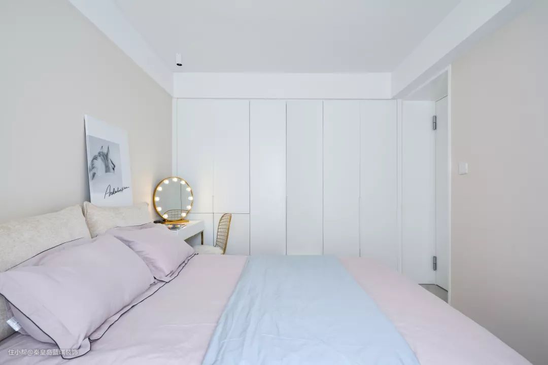 在卧室的另一侧是嵌入式的衣柜,衣柜的边上摆放一个梳妆台,整体白色的柜子加上金属元素的椅子、镜子,看起来也非常精致