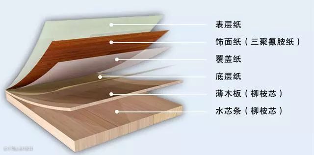 - 工艺:由表层纸、色纸、基纸(多层牛皮纸)三层构成的,其基材是刨花板或中纤维板,经过高温压贴后制成。