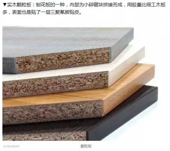 工艺:木屑及木材边角料,加粘合剂后压制而成。看刨花板的板材横截面是由三层组成的,外面两成是细的颗粒,中间一层的是比较大的颗粒。
