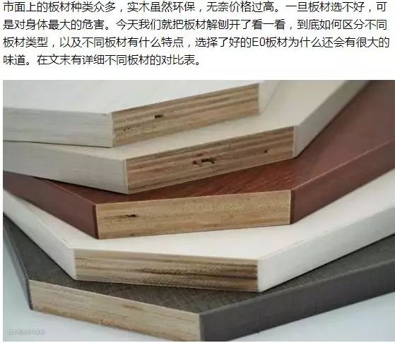 板材本身的工艺和施工中的胶水(夏天施工可减少胶水用量)是影响室内空气的两大污染源。不同板材类型只作为加工工艺区分,不能绝对代表环保型,所以并不是所有的刨花板要比密度板环保,无论什么板材,都应首选E0级标准的产品。