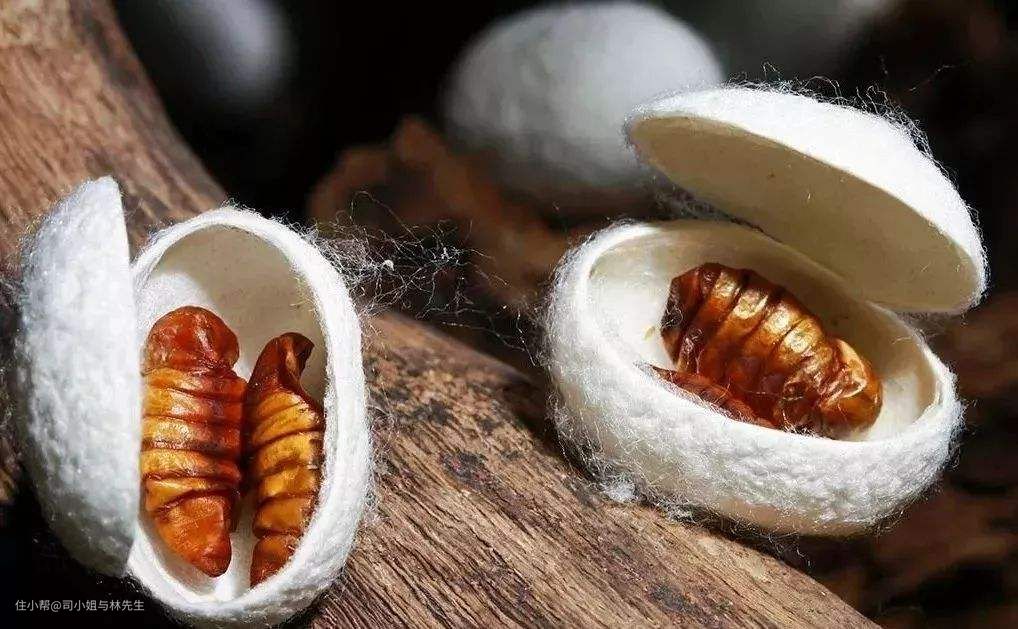 双宫茧是指两个蚕宝宝做在一起形成的蚕茧,形状比一个蚕做的蚕茧要大,切割后可以看到两个蚕蛹,因其吐丝时相互缠绕,不是一根丝到底,故这样的蚕茧的丝不像一个蚕做的那么紧实,它无法抽丝做真丝布料,却是做蚕丝被最好的原料,因为双宫茧做出的丝绵更为蓬松。