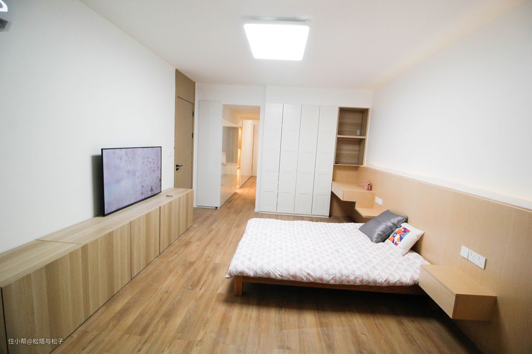 吸睛的床头板一体不是宜家,是客厅同款木饰面,内嵌灯带,这间养老主卧有没有超级洋气?饰面和宜家柜子有轻微色差,宜家什么时候出售饰面板和饰面贴皮就完美了。