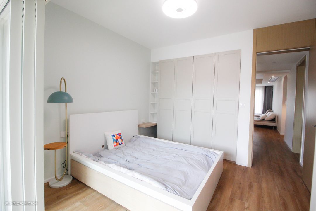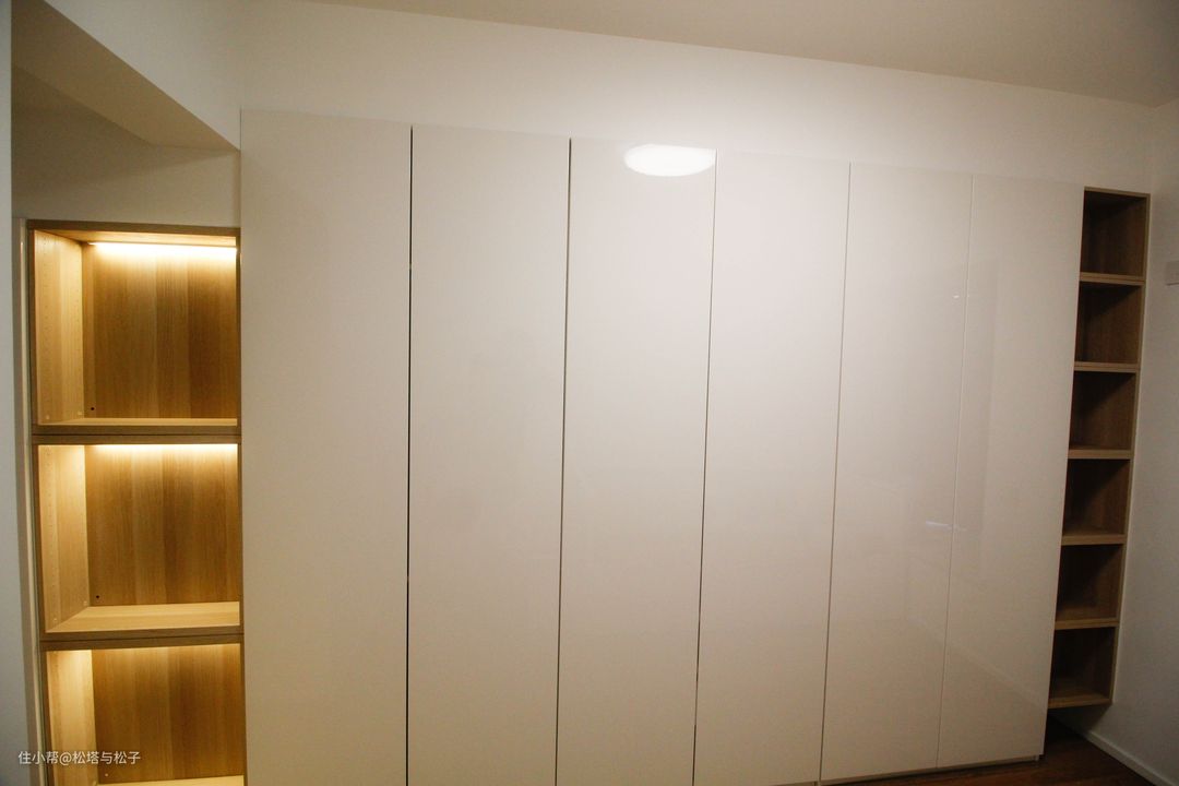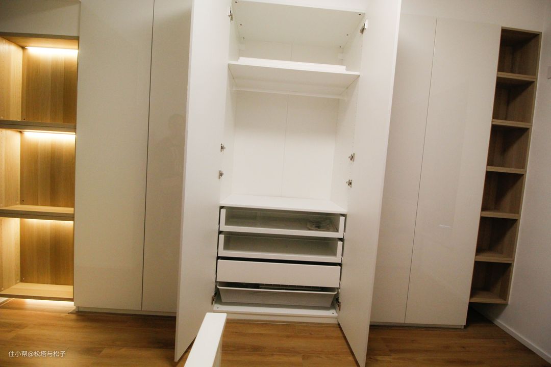 卧室衣柜这面墙原始尺寸2400mm,斯莫约拉搁架宽300mm,两个1000mm的帕克斯衣柜,多出的十公分留给木工师傅把柜体嵌入,门的位置也向房间推入衣柜的厚度600mm,柜子以上部分石膏板封住,最后视觉效果就是衣柜嵌入,收纳空间足够又不会压抑。