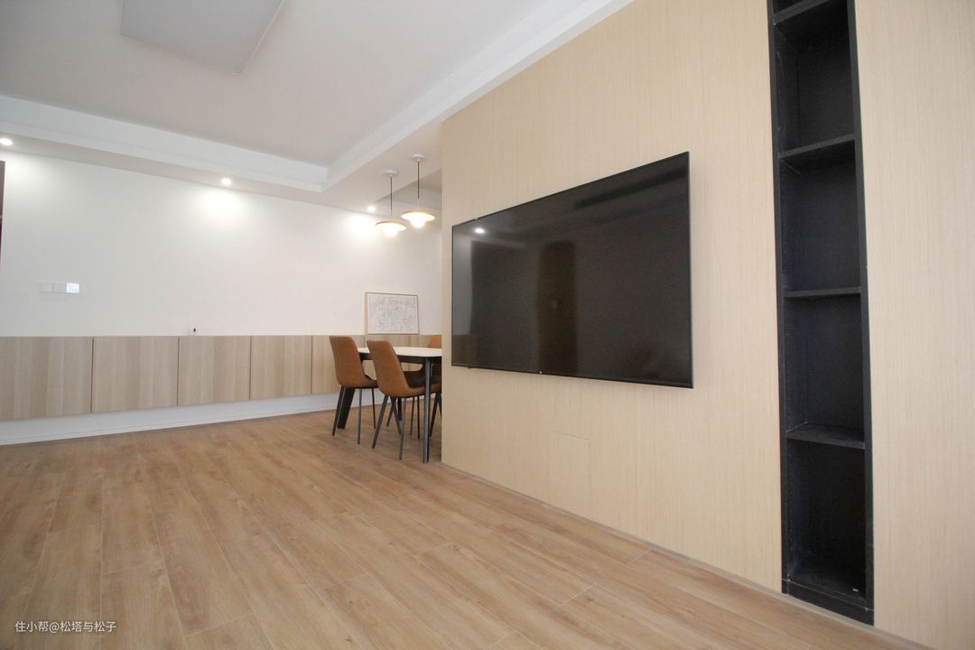 木工师傅改窄后嵌入电视墙面,黑色做背景能更好的展示摆件,同时平衡视觉,搭配70寸电视显得很高级。