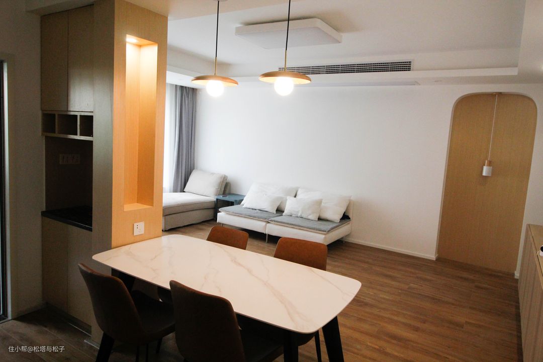 将餐桌区作为客厅与玄关的软隔断,延续了一整排贝达带来的视觉延伸感,轻松摆下1.6米的岩板餐桌,以后有事没事跑来蹭老爸的饺子才方便。