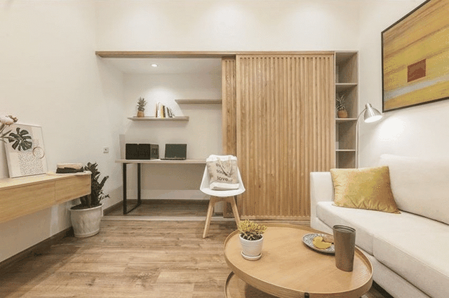 客厅的设计比较多元化,既有会客区,还有衣柜收纳区,同时还有工作区,利用推拉门柜门划分出一处比较隐蔽的区域,作为收纳和办公区。这个设计无论是大户型还是 小户型,都非常适合!如果你家也想多一处功能区的话,不妨照着装一个。你一定会爱上它!