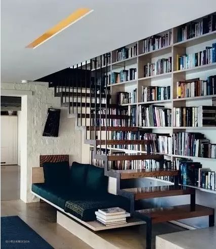 楼梯整面墙书柜+沙发,变成家中非常舒服的阅读角。