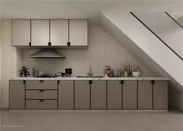 楼梯底下,地柜+吊柜,组合出一个小厨房,简单利落的设计,轻松下厨,享受居家好生活。