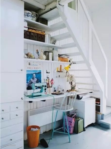 楼梯下摆一张窄窄的书桌,读书写字时坐着,也不会觉得矮。