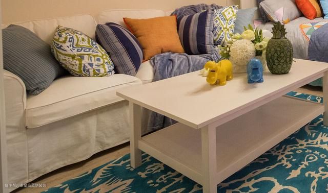 沙发是在宜家里买的,搭配了很多种颜色的抱枕,排放在一起,恰到好处!