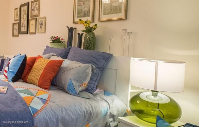 卧室床上的家居用品和客厅的沙发颜色遥相呼应,床头一的一盏灯是亮点,感觉超梦幻的。