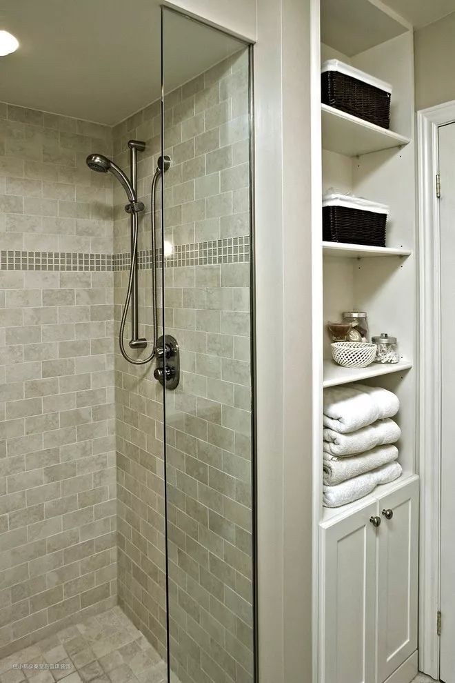 不管怎么说,卫生间这个地方的收纳,总是需要把能用的地方都给用上,提醒各位小户型的业主们,镜柜和浴室柜都是很重要的收纳地点,不能浪费了。不能做壁龛的,也要在淋浴区的转角装个置物架,放东西很方便,但是要买可防水的,防止生锈。