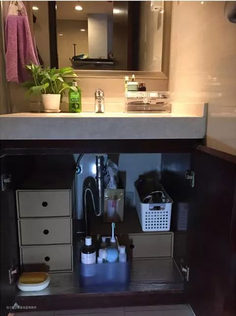 洗手柜本身也承担着很多的收纳,底部的柜子内虽然走了部分的水,但也还有很多东西,搭配一些收纳盒,就可以分类存放各种清洁用品了。