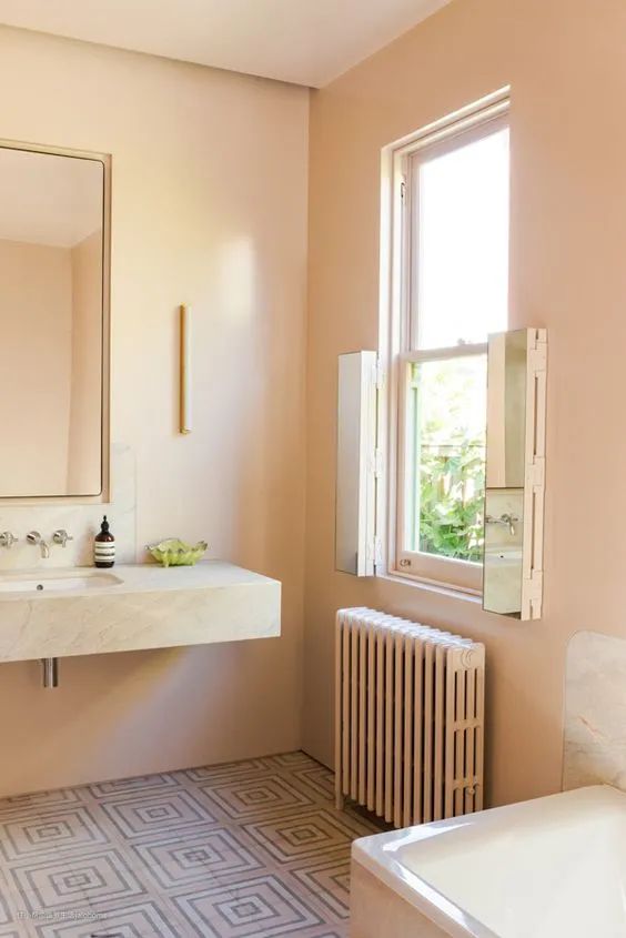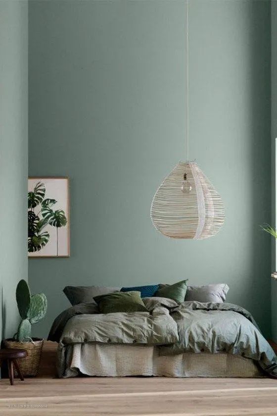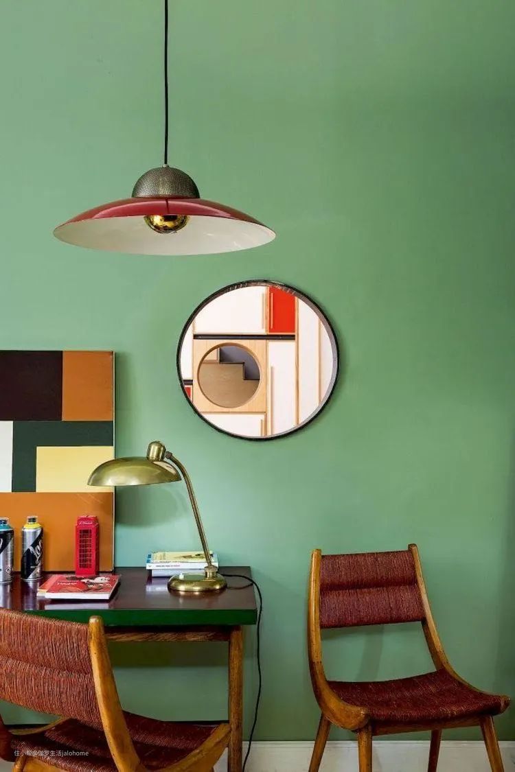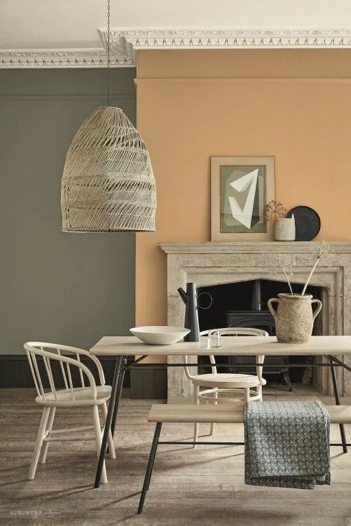 蜜瓜色墙面、浅豆绿后墙、浅褐色灯罩和壁炉、米色地板,配合在一起,灰调子丰富,再以橄榄色踢脚线隔开,效果就好多了。