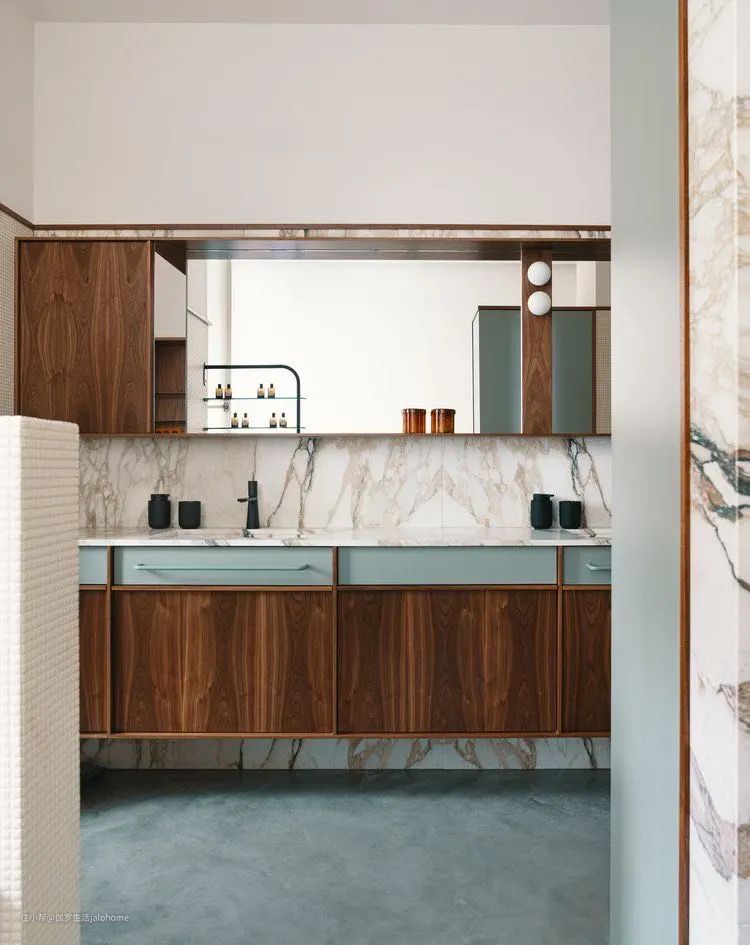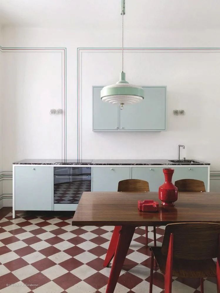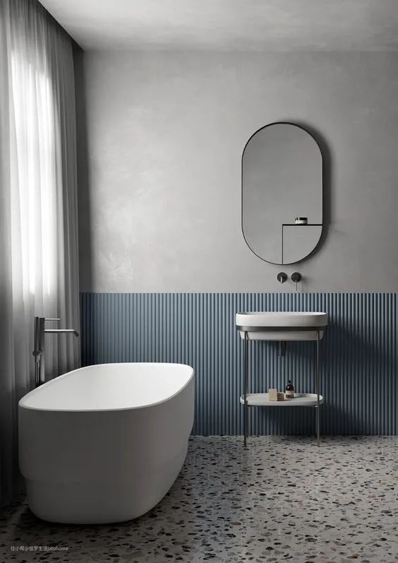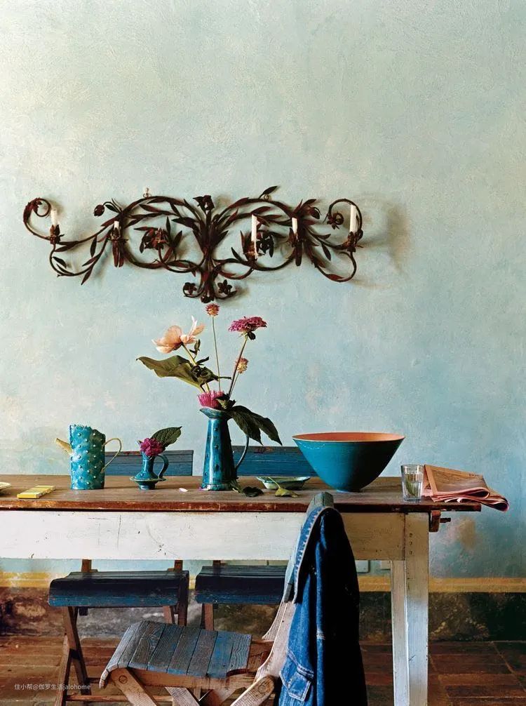 这个也是,灰蓝色墙裙,加上青灰色墙面,水磨石铺地,再配一袭半透明纱帘,加上镜中反射的对面灰墙,各种浅灰调子配在一起,这才是莫兰迪。假如一色全白,这个灰蓝色墙裙是不可能好看的。