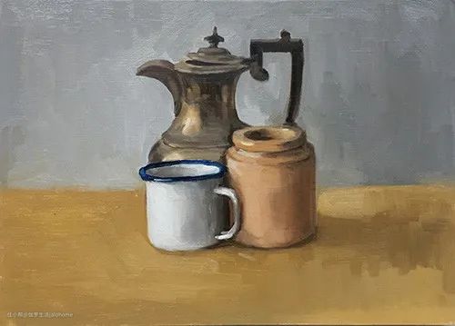 这两幅,第一张静物数量少,三个,于是搪瓷被口的深蓝色,还有铜壶的质地,包括桌面的黄色,都有意无意地在丰富着画面。第二张器型材质背景都没太多变化,但是加入了一个红色小物。