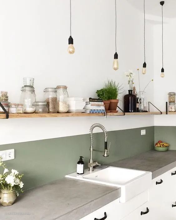 同样的灰绿色,加上一个米灰色台面和蜜黄色搁板,是不是就好一些了?