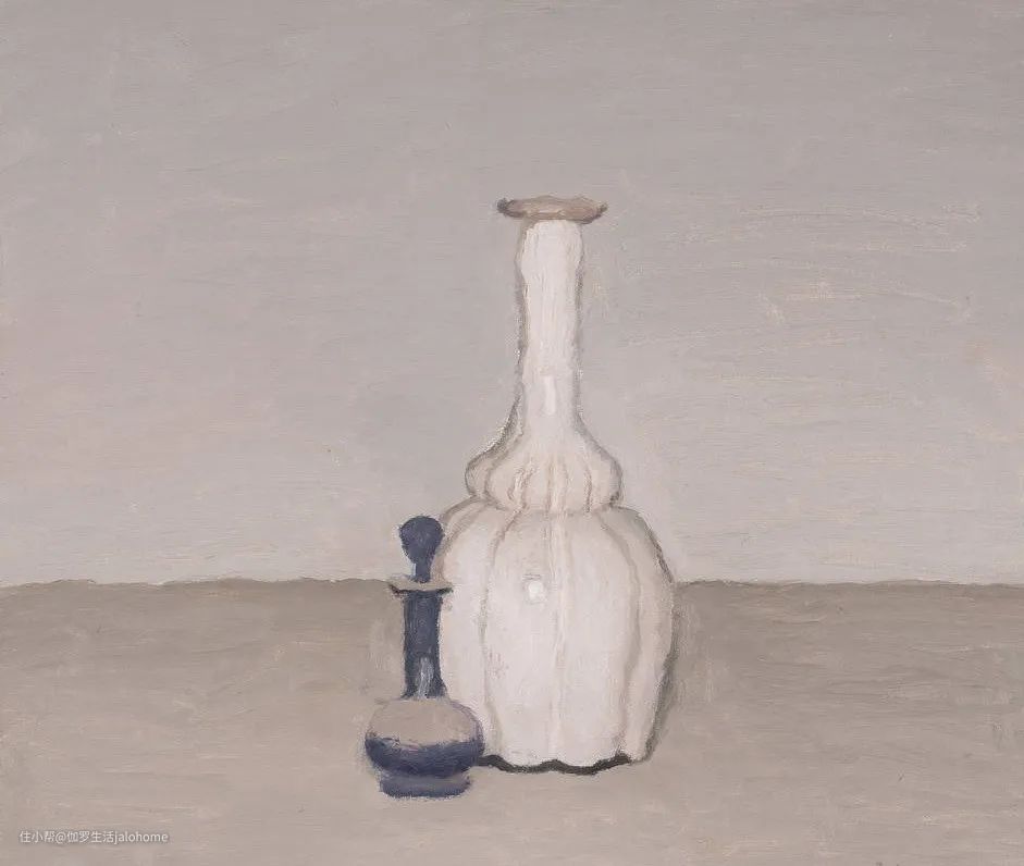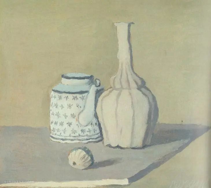 莫兰迪的静物很少有少于三个物体的,而且一旦静物数量减少,他一般就会在颜色、器型或是花纹等方面给画面“加戏”。不信你看:▼