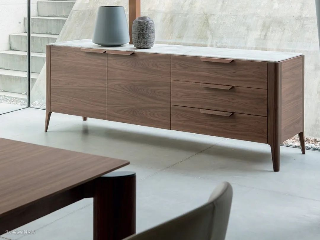 Atlante 3 餐边柜是由天然木材和大理石制成。它配备了两个门和三个抽屉。大理石台面使它显得豪华别致,平行六面体的紧实度由细脚支撑,以产生不寻常的灯光效果。