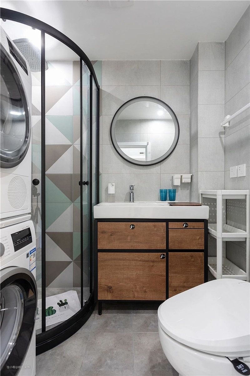 卫生间通过扩充后,同时满足了淋浴区、洗漱区、马桶以及洗衣机烘干机的摆放,依旧是清新整洁的风格,简单又方便实用。