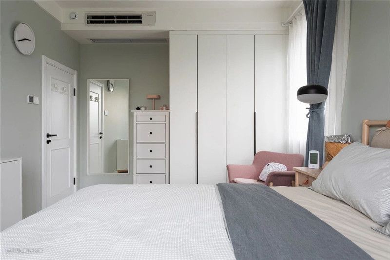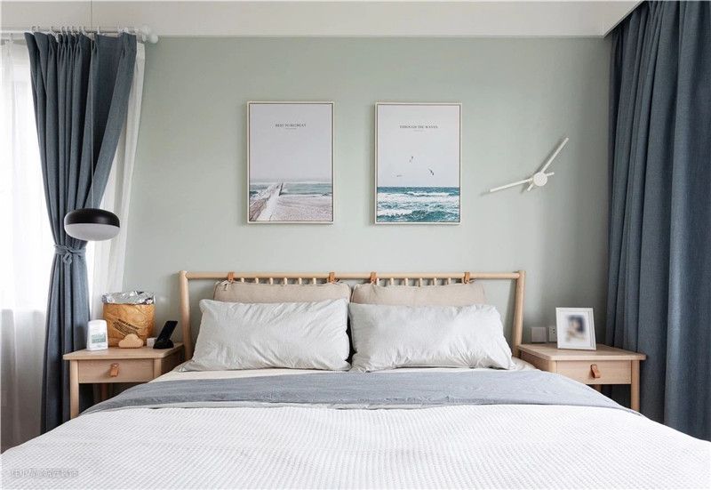 主卧地面铺设木色地板,墙面为了整体搭配选用了与客厅同颜色的乳胶漆,整体清新又有文艺气息。