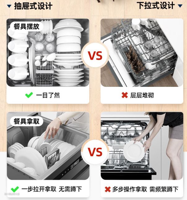 后来虽然有部分品牌创新式的使用了抽屉式设计,避免了弯腰操作,不过由于是纵向储物,在同样的占地面积下,容量却被传统欧式吊打,造成了一定的空间浪费,所以市占率一直不高。