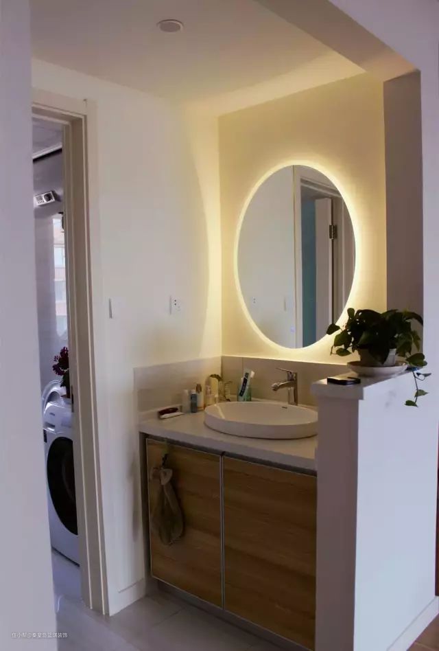 不喜欢隔断的可以选择做个半墙把洗手台给挡住就好,上方是开放的造型,洗手台本身的镜子、置物架等就是最好的装饰品。