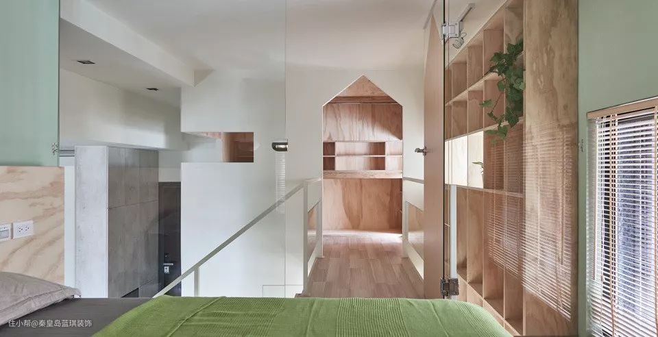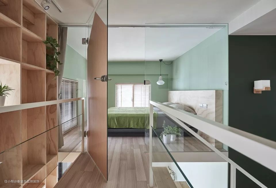 二楼的主卧室也是以绿色为主,搭配木质的床头靠背显得更加的清新和自然,木门加上玻璃作为隔断,光线非常棒。