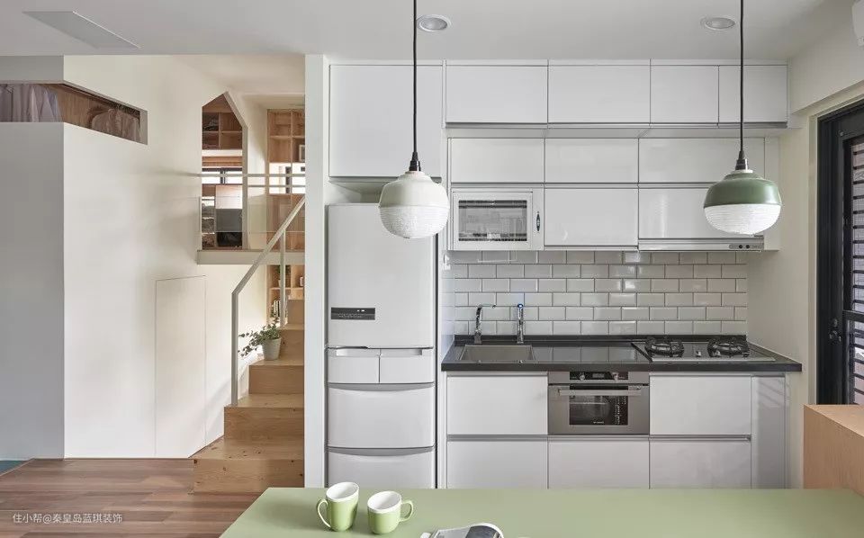 在餐桌的侧方做了厨房,空间比较小,还把冰箱也嵌入其中,开放式的厨房空间就需要注意油烟问题,平时避免爆炒、油炸。