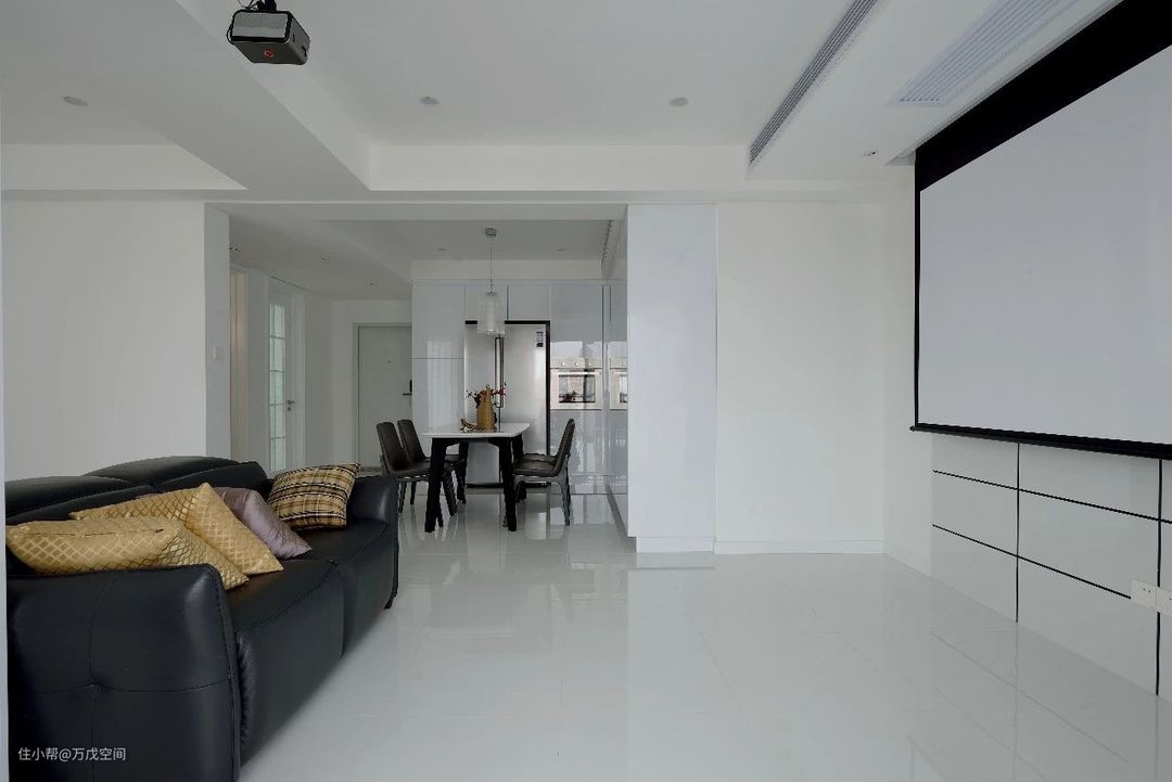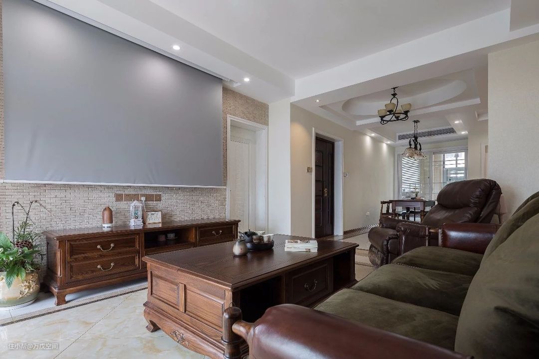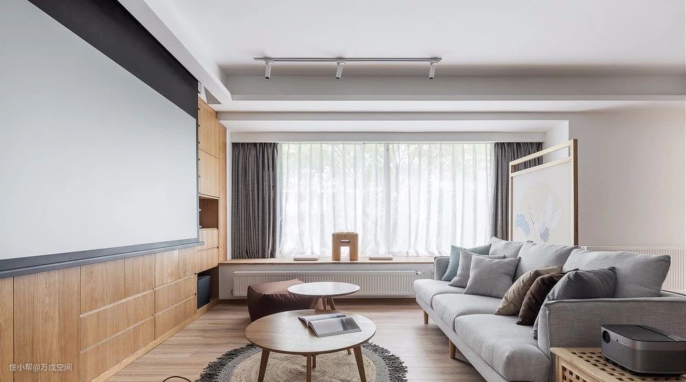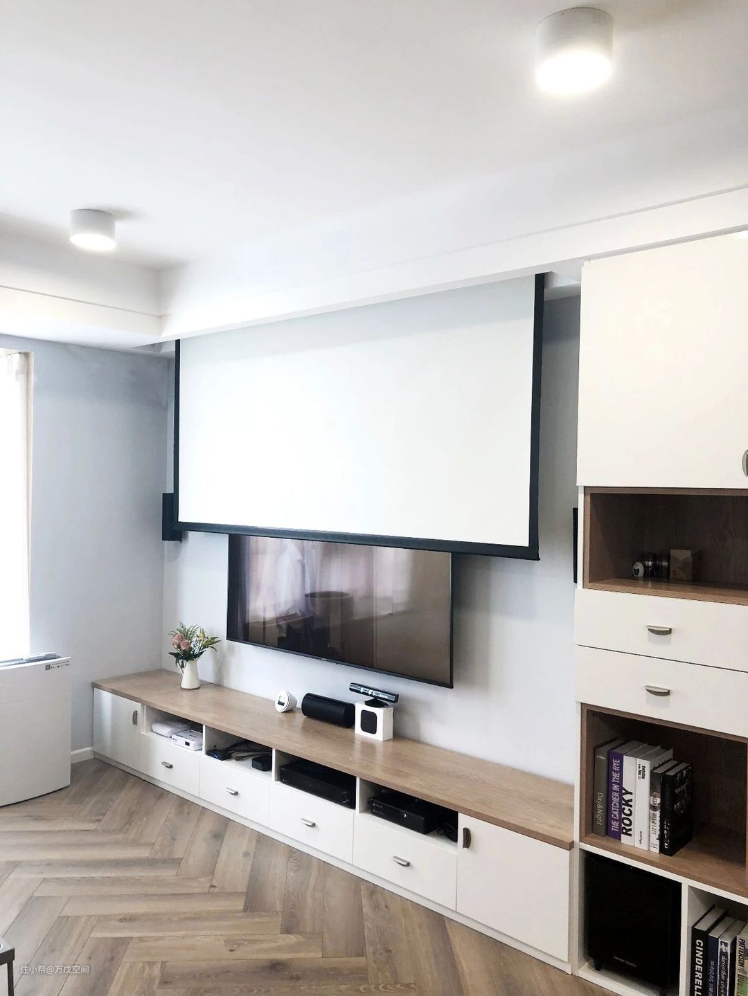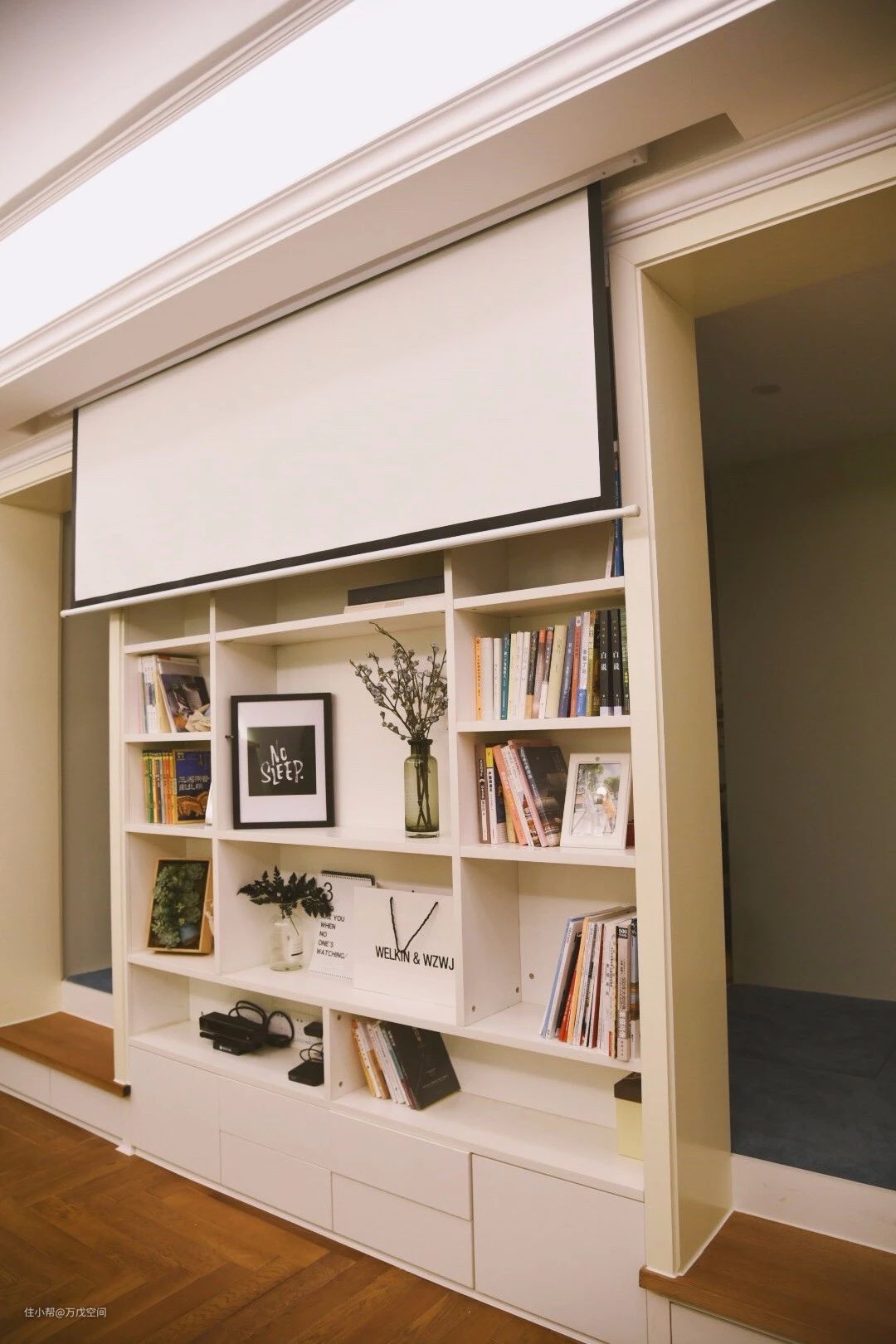 最后介绍的这种是最为主流的幕布设计方式,通过在电视墙上方的吊顶造型,预留出相应的幕布安装槽与插座,把幕布暗藏到这个槽里面,保持空间的简洁与常规的电视墙功能,需要的时候就可以把幕布放下来,让客厅变身一个大屏的观影空间,美观而又方便。
