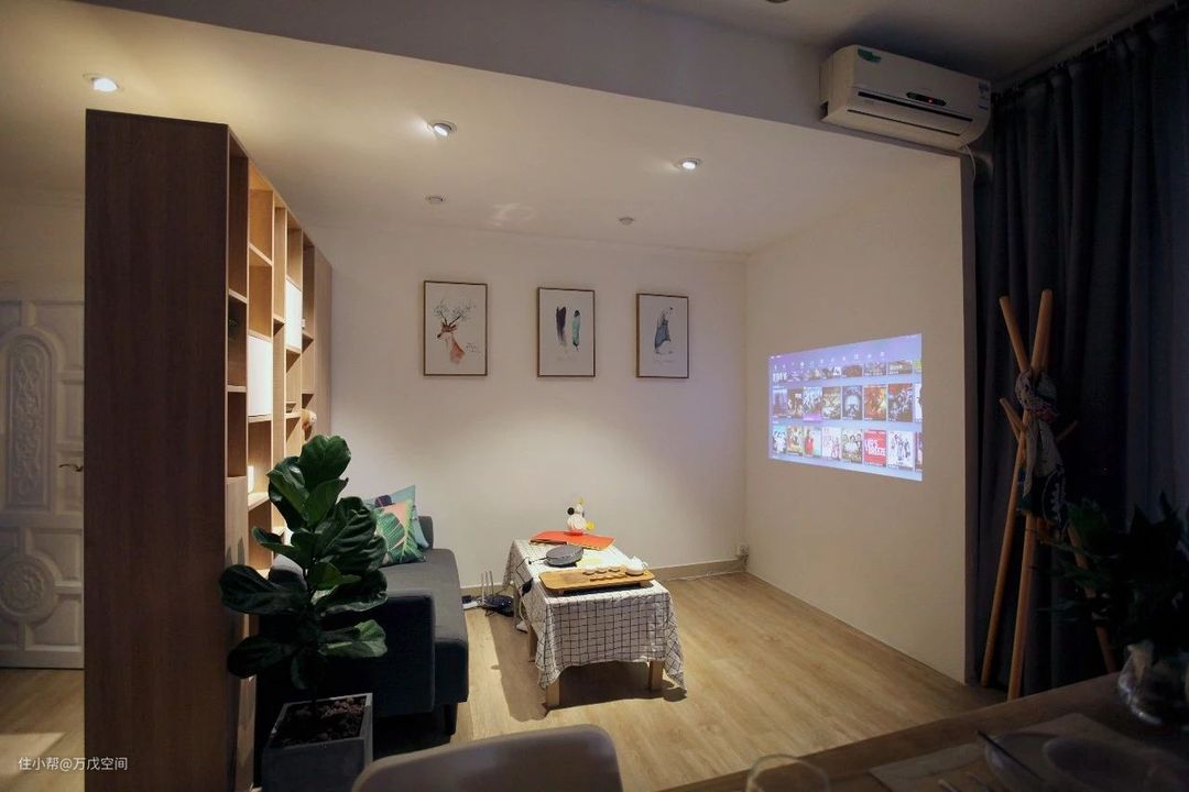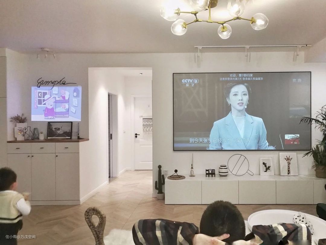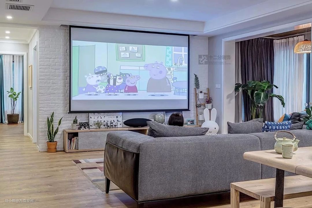 一般平整的白墙甚至浅色墙面,都是可以承载基本的投影屏幕功能,而且画面质量也还算不错的,如果电视墙原本墙面就是白色或浅色的话,那么就可以尝试直接在白墙上投影,觉得效果可以的话就免去安装幕布的麻烦了。这样简单的做法,适合一些已经装修没有预留幕布安装位置的家庭。