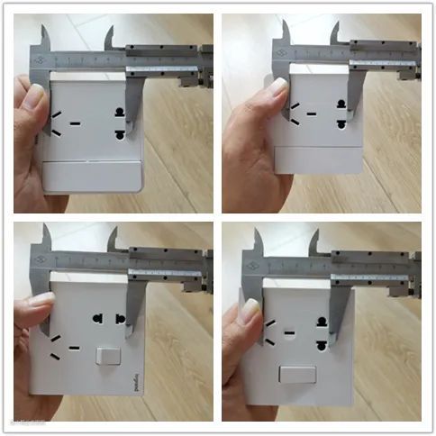相对于五孔插座来说,带开关五孔插座的孔间距必须更长才能同时满足两个插座的需求,经过测量最远的两款插座依然是西门子和罗格朗,孔间距都超过了55mm,而施耐德和西门还是没超过50mm。
